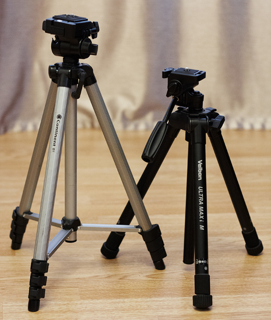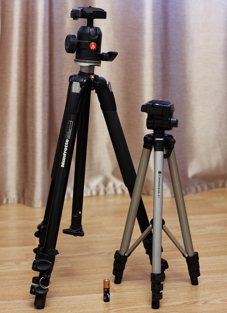 Так уж вышло, что начался сезон разъездов. Поезда, самолёты.... ...вещей и так целый чемодан большой - мой Манфротто туда крайне не хотелось бы впихивать. Поэтому была поставлена задача купить как можно меньшего размера штативчик и как можно легче. Осложнялась задача тем, что выбирать нужно было из того, что есть в наличии в городе N, где и выбора-то никакого нет. Особо мудрить не стал: пришёл в магазин и сходу приобрёл за 1000р (прошу заметить, 1000р. сегодня и она же год-другой назад - разные вещи, поэтому ту тыщу из начала статьи ставить один к одному с этой нельзя, а стало быть и способности приобретённого товара тоже) Continent B1. Что тут сказать.... ...такого хлипкого Г ещё поискать. Покажу его рядом с Manfrotto 190 xb и "мерной" батарейкой формата АА.