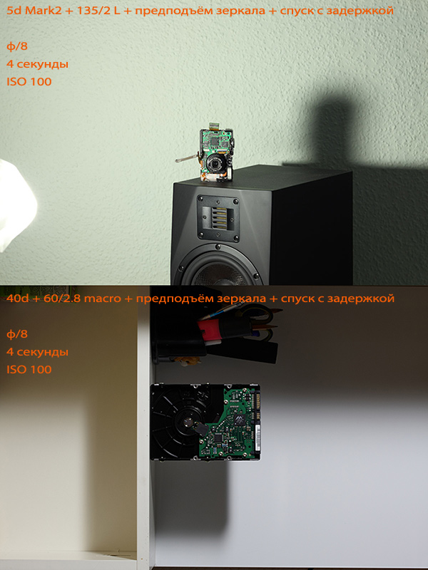 Нижний снимок (пример 3) сделан мной на 40д + 60/2.8 с набором Manfrotto 190xb + 488cr2. Хочу напомнить читателю о том, как воспевают прозрачность картинки и резкость 100%-го кропа полнокадровой камеры, да ещё совместно с фиксом - элькой. И воспевают во многом не зря. Но здесь напоминаю затем, что лично я не увидел разницы в резкости между своим результатом (пример 5) и наилучшим из теста выше. На мой взгляд, здесь абсолютный паритет между Gitzo 1541T + markins q3 у него и Manfrotto 190xb + 488cr2 у меня. Впрочем, оставляю для вас возможность оценить результаты собственными глазами – вдруг мои меня подводят.