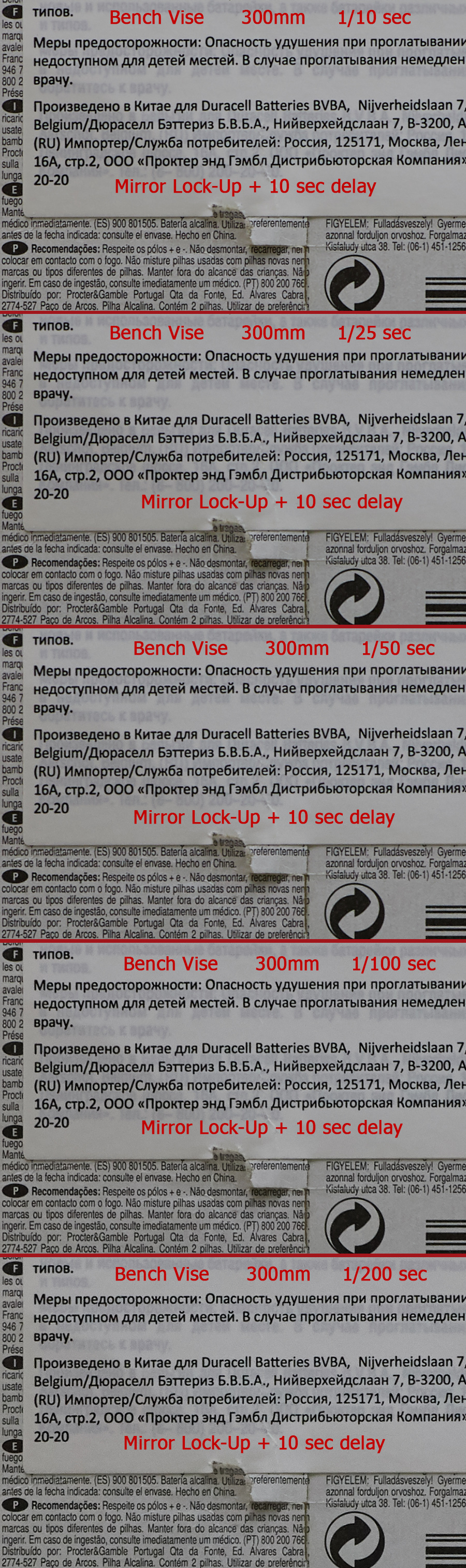 Равно как остаются дома (в мастерской друзей) железные тиски. Да, вы не "ослышались", я решил провести эксперимент, дающий ответ на часть вопросов. Не на всё, конечно же. Итак, мощная площадка от Манфротто прикручена к камере, зажата в тиски, которые жёстко сцеплены с мощным столом, железными ногами стоящим на бетонном полу. Т.е. имеем сверхмощный штатив с гипермощной головой. Так выглядит исходная сцена. А ниже результаты. Слева предподъём и задержка спуска 10 секунд, справа без предподъёма и задержка 2 секунды.